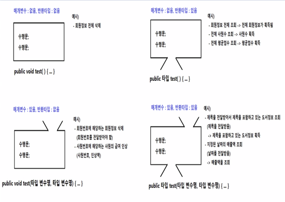 * 메소드이름 : 수행문을 포함하고 있는 코드블록의 이름이다.
