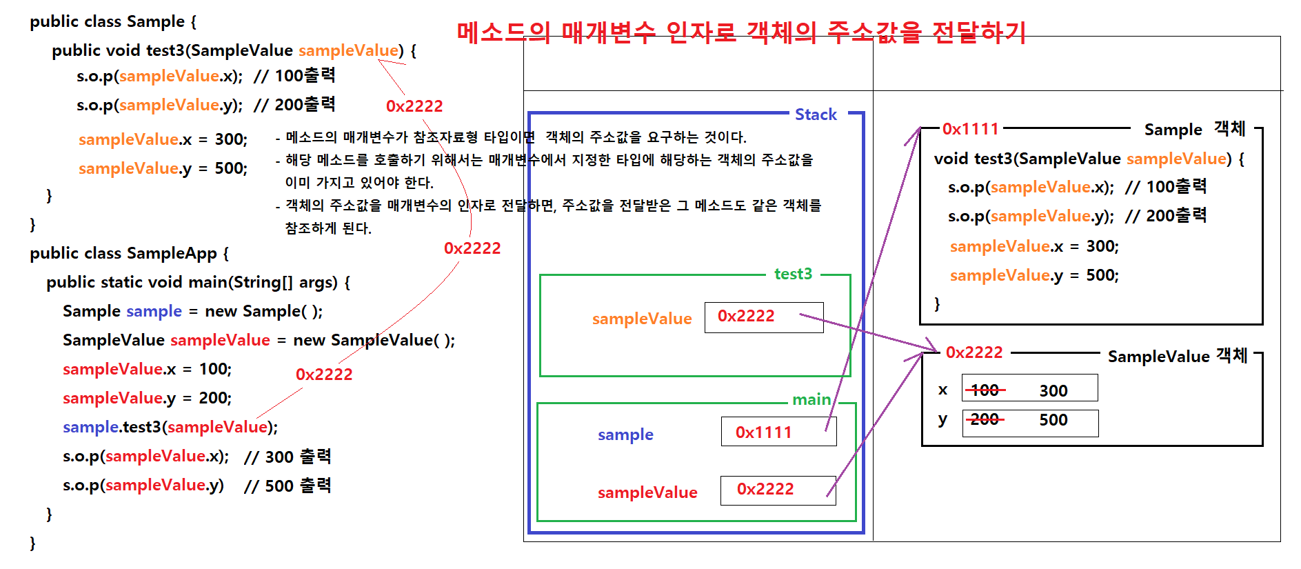 - 객체의 주소값을 매개변수의 인자로 전달하면, 주소값을 전달받은 그 메소드도 같은 객체를 참조하게 된다.