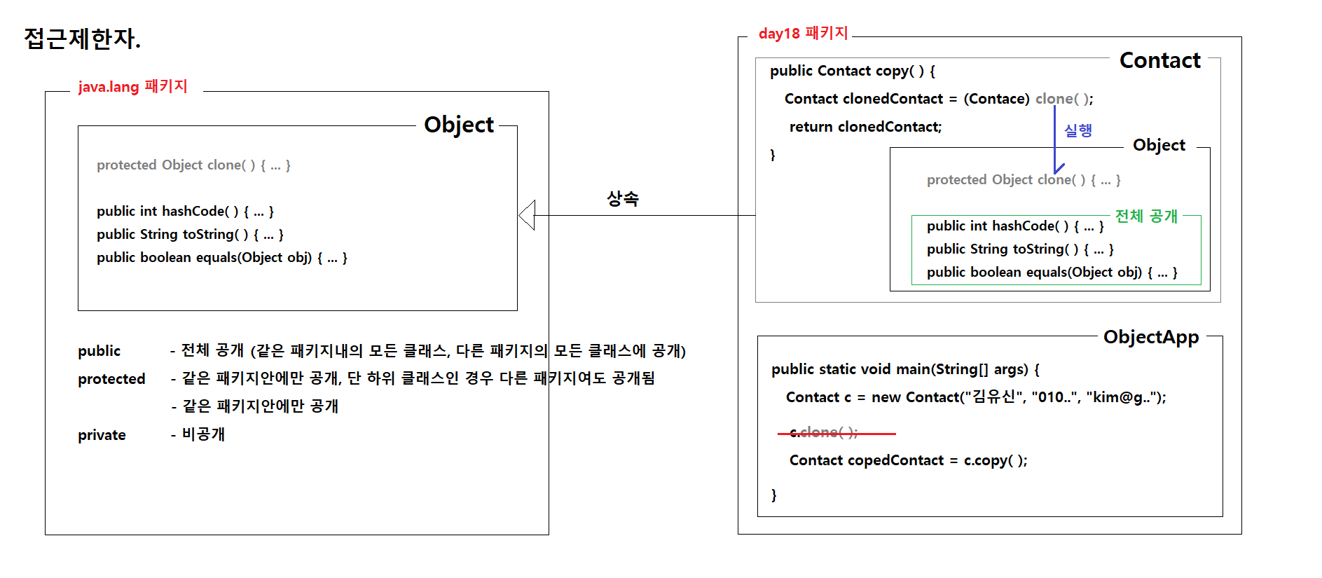 ObjectApp에서 접근제한자가 protected인 c.clone();은 호출할 수 없고 public인 c.copy를 호출 가능하다.
