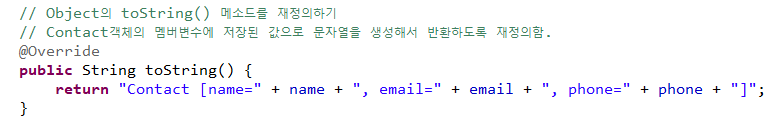 package day18; import java.lang.reflect.Field; public class ContactApp { public static void main(String[] args) { Contact c1 = new Contact("김유신", "010-1111-1111", "kim@naver.com"); Contact c2 = new Contact("강감찬", "010-2222-2222", "kang@naver.com"); Contact c3 = new Contact("강감찬", "010-2222-2222", "kang@naver.com"); // Object의 주요 메소드 확인하기 // int hashCode(); - 객체의 해시코드값을 반환한다. System.out.println("### c1참조변수가 참조하는 Contact객체의 해시코드 확인하기"); System.out.println(c1.hashCode()); System.out.println(c2.hashCode()); System.out.println(c3.hashCode()); // 같은 이름이면 해시코드가 같도록 재정의해놓았기 때문에 해시코드가 같다. // String toString() - 참조변수가 참조하는 객체에 대한 간단한 설명을 반환한다. // 패키지명이 포함된 클래스 이름@16진수 해시코드값 // 객체의 멤버변수값으로 구성된 문자열을 반환하도록 toString() 메소드를 재정의하는 경우가 많다. // Object의 toString() 재정의의 대표적인 예 // String 클래스는 String객체가 가지고 있는 문자열을 반환하도록 재정의했다. // Date 클래스는 Date객체의 현재 날짜와 시간 정보를 문자열로 반환하도록 재정의했다. System.out.println("### c1, c2참조변수가 참조하는 Contact객체의 정보를 문자열로 반환한다."); System.out.println(c1.toString()); System.out.println(c2.toString()); System.out.println(c1); // 실제로 실행되는 코드 System.out.println(c1.toString()); System.out.println(c2); // 실제로 실행되는 코드 System.out.println(c2.toString()); // String str = new String("abc"); // String에는 파이널이 없기 때문에 재정의 가능 // System.out.println(str); // boolean equals(Object other) - equals(Object other)를 실행하는 객체와 매개변수로 전달받은 객체가 동일한 객체인지 여부를 반환한다. // - Object의 equals() 메소드는 두 객체의 주소값을 비교하는 메소드다. // - Object의 equals() 메소드는 객체의 동일성을 검사한다.(같은 객체인지 비교) // - Object의 equals() 메소드를 객체의 동등성을 검사하도록 재정의한다.(hashcode와 equals를 재정의해야 함) // Object의 equals() 재정의의 대표적인 예 // String 클래스는 Object의 equals() 메소드를 재정의해서 객체가 서로 다르더라도 // 객체가 갖고 있는 문자열이 같으면 true가 반환된다. // String 클래스의 equals() 메소드는 동등성을 검사한다.(같은 값인지 비교) System.out.println("### c1, c2참조변수가 참조하는 Contact객체가 같은 객체인지 여부를 반환한다."); System.out.println(c1.equals(c2)); // false System.out.println(c2.equals(c1)); // false System.out.println(c1.equals(c3)); // false System.out.println(c2.equals(c3)); // true. c2와 c3참조변수가 참조하는 객체는 같은 이름을 가지고 있다. // Class<?> getClass() - 객체의 설계도 정보를 표현하는 Class객체를 반환한다. // - Class객체는 패키지정보, 클래스정보, 멤버변수 정보, 생성자 정보, 메소드 정보를 모두 포함하고 있다. Class<?> clazz = c1.getClass(); // 키워드는 변수명으로 쓸 수 없어서 class대신 clazz라고 적음. Field[] fields = clazz.getDeclaredFields(); // 멤버변수에 대한 정보를 획득하는 메소드를 호출하고 Field배열에 반환값을 저장한다. for (Field field : fields) { String typeName = field.getType().getName(); String fieldName = field.getName(); System.out.println(typeName + ", " + fieldName); } } }