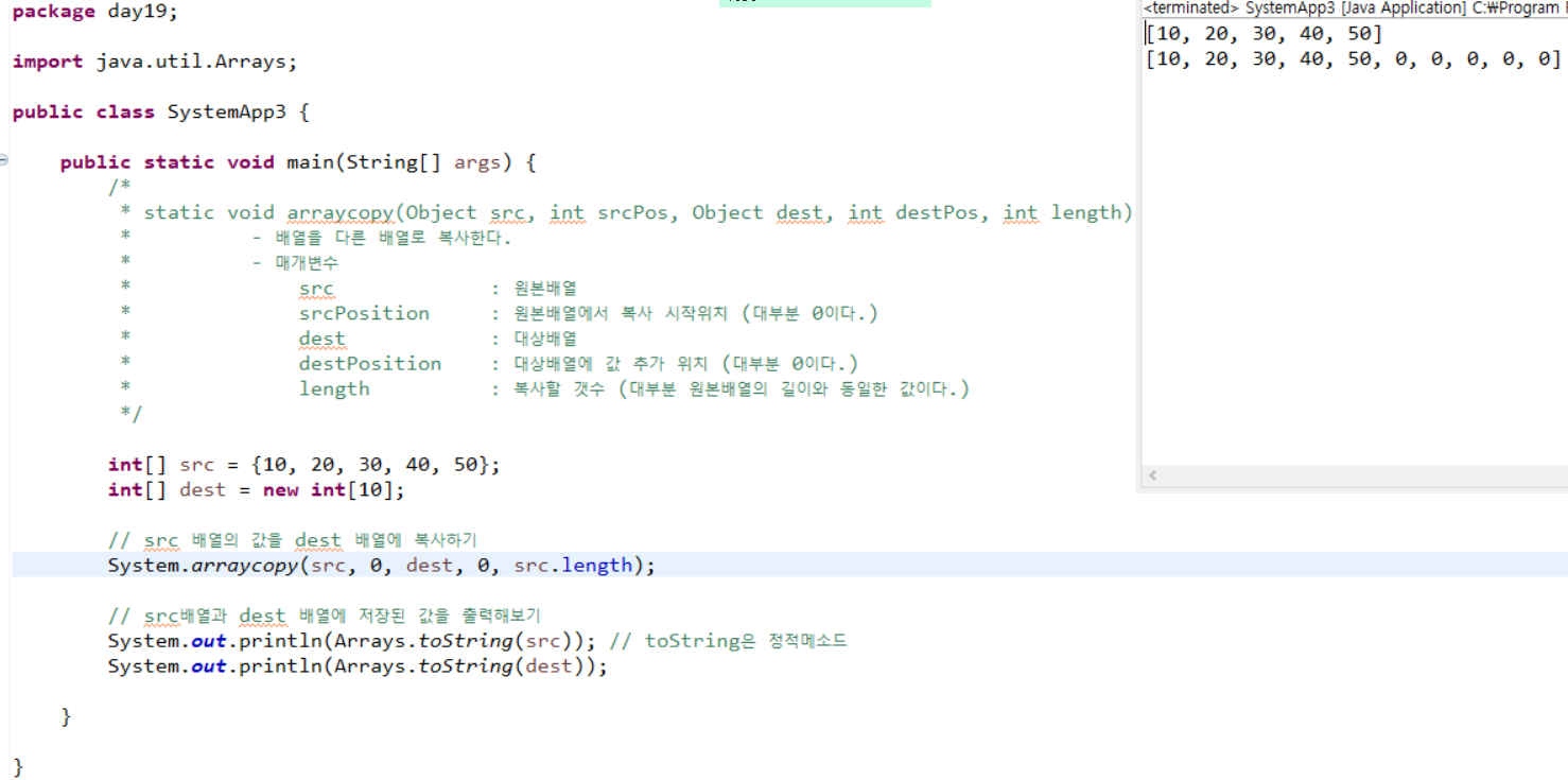 - 배열을 다른 배열로 복사한다. (배열의 크기는 불변이기 때문에 주로 배열의 크기를 늘려야 할 때 새로운 배열을 만들고 복사할 때 사용한다.)