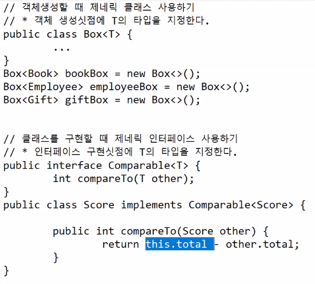 public inteface Comparable<T> { int compareTo(T other); } //제네릭 인터페이스를 구현한 클래스의 T가 Product로 대체된다. public class Product implements Comparable<Product> { private String name; private int price; public int compareTo(Product other) { return this.price - other.price; } }- 구현클래스 정의 싯점에 데이터타입을 지정하지 않고, 객체 생성싯점에 지정하게 하기