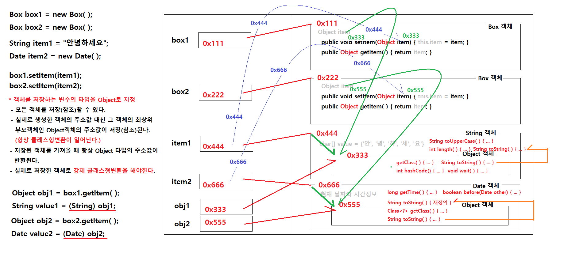 박스 안에 여러가지 종류의 객체를 담으려면 객체를 담을 수 있는 변수를 Object로 만들면 된다. 이 경우 항상 클래스형변환이 일어난다.