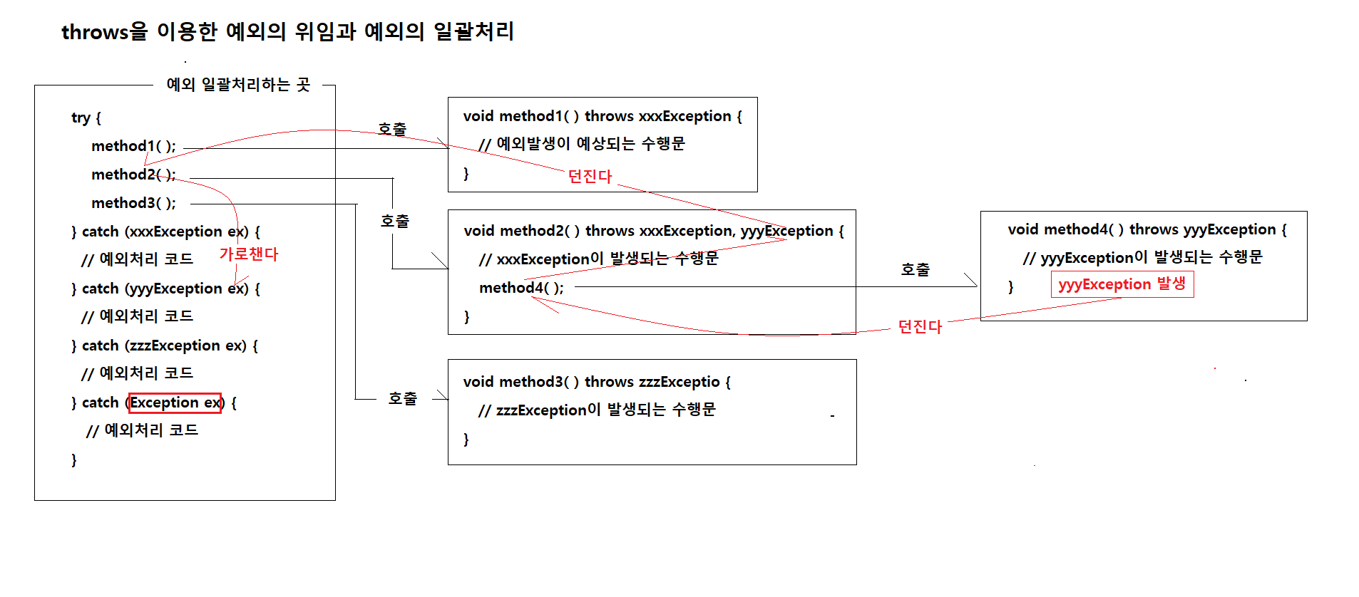 - 메소드에서 발생하는 예외를 직접 처리하지 않고, 그 메소드를 호출하는 측으로 예외처리를 위임하는 것이다.