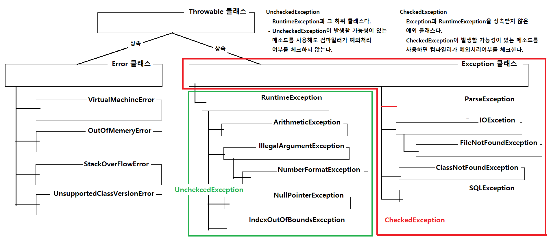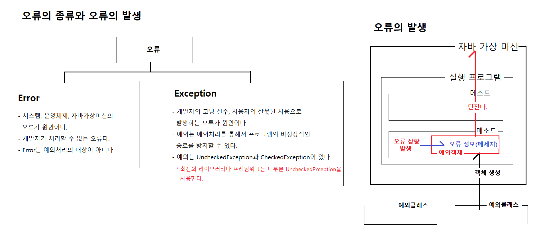 - 예외는 UncheckedException(컴파일러가 예외처리 여부를 체크하지 않는 예외)과 CheckedException(컴파일러가 예외처리 여부를 체크하는 예외)이 있다.