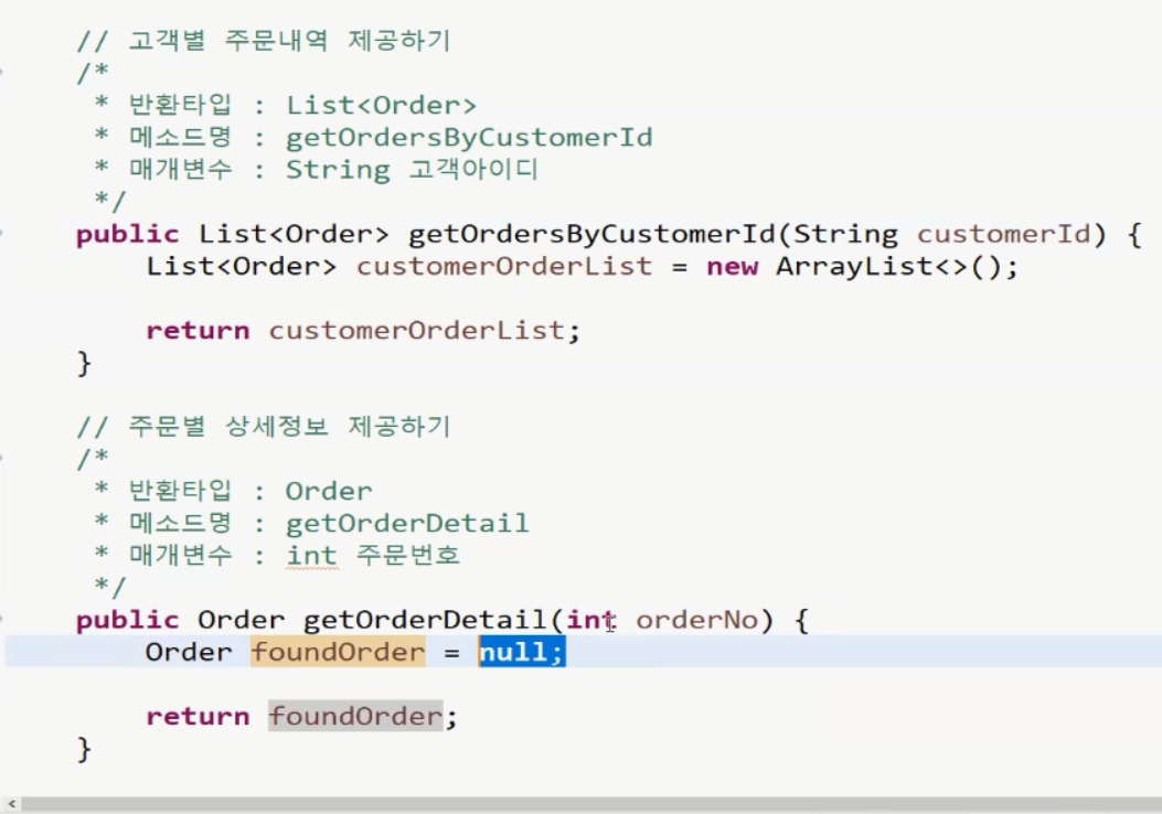 위에는 반환타입이 List인 경우이기 때문에 메소드 구현시 첫문장으로 List객체를 생성하고,
