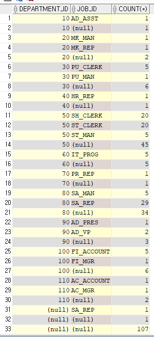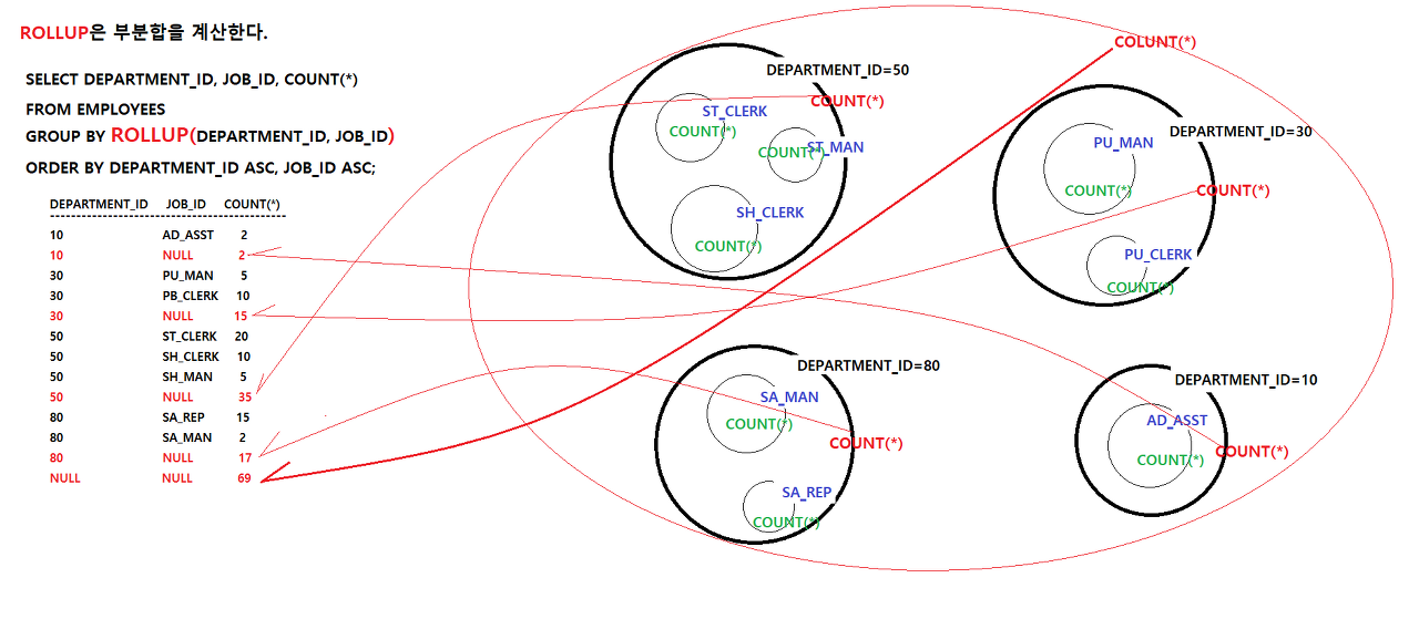 -------------------------------------------------------------------------------- -- 두 번 그룹화하기, ROLLUP (부분합 & 전체합도 함께 나옴) -------------------------------------------------------------------------------- -- 두 번 그룹화하기 -- 부서별, 직종별 사원수를 조회하기 (1) SELECT DEPARTMENT_ID, JOB_ID, COUNT(*) FROM EMPLOYEES GROUP BY DEPARTMENT_ID, JOB_ID ORDER BY DEPARTMENT_ID ASC, JOB_ID ASC; -- ROLLUP -- 부서별, 직종별 사원수를 조회하기 (2) SELECT DEPARTMENT_ID, JOB_ID, COUNT(*) FROM EMPLOYEES GROUP BY ROLLUP (DEPARTMENT_ID, JOB_ID) ORDER BY DEPARTMENT_ID ASC, JOB_ID ASC;