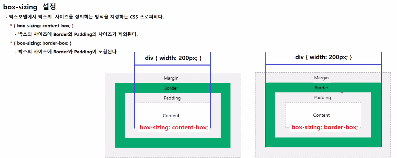 - css에서 정의한 width가 border와 padding, content의 너비를 합한 것으로 정의된다.