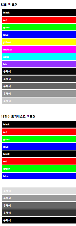 <title>색 표현</title> <style> div{ margin: 5px; padding: 10px; color: white; font-weight: bold; } </style> </head> <body> <h1>색</h1> <h3>색이름으로 색표현</h3> <div style="background-color: black;">black</div> <div style="background-color: red;">red</div> <div style="background-color: green;">green</div> <div style="background-color: blue;">blue</div> <h3>RGB 색 표현</h3> <div style="background-color: rgb(0, 0, 0);">black</div> <div style="background-color: rgb(255, 0, 0);">red</div> <div style="background-color: rgb(0, 255, 0);">green</div> <div style="background-color: rgb(0, 0, 255);">blue</div> <div style="background-color: rgb(255, 255, 0);">yellow</div> <div style="background-color: rgb(255, 0, 255);">fuchsia</div> <div style="background-color: rgb(0, 255, 255);">aqua</div> <div style="background-color: rgb(150, 50, 255);">bts</div> <div style="background-color: rgb(10, 10, 10);">무채색</div> <div style="background-color: rgb(50, 50, 50);">무채색</div> <div style="background-color: rgb(100, 100, 100);">무채색</div> <div style="background-color: rgb(150, 150, 150);">무채색</div> <div style="background-color: rgb(200, 200, 200);">무채색</div> <div style="background-color: rgb(255, 255, 255);">무채색</div> <h3>16진수 표기법으로 색표현</h3> <div style="background-color: #000000;">black</div> <div style="background-color: #ff0000;">red</div> <div style="background-color: #00ff00;">green</div> <div style="background-color: #0000ff;">blue</div> <!--숫자가 두개씩 같을 때에는 하나만 적어도 된다.--> <div style="background-color: #000;">black</div> <div style="background-color: #f00;">red</div> <div style="background-color: #0f0;">green</div> <div style="background-color: #00f;">blue</div> <div style="background-color: #fff;">무채색</div> <div style="background-color: #ddd;">무채색</div> <div style="background-color: #999;">무채색</div> <div style="background-color: #666;">무채색</div> <div style="background-color: #333;">무채색</div> <div style="background-color: #000;">무채색</div> </body> </html>-> rgb 3가지 숫자가 똑같을 경우 무채색을 띈다.