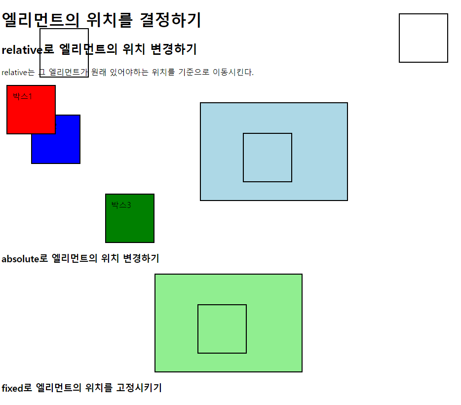 <title>포지션</title> <style> div.box { box-sizing: border-box; border: 2px solid black; padding: 10px; margin: 10px; width: 100px; height: 100px; } #box-1 { background-color: red; z-index: 1; } #box-2 { position: relative; left: 50px; top: -50px; background-color: blue; z-index: -1; } #box-3 { position: relative; left: 200px; background-color: green; } .container { box-sizing: border-box; border: 2px solid black; padding: 10px; margin: 10px; width: 300px; height: 200px; } #container-1 { position: absolute; left: 400px; top: 200px; background-color: lightblue; } #container-2 { position: relative; left: 300px; background-color: lightgreen; } #box-4, #box-5, #box-6 { position: absolute; left: 75px; top: 50px; } #box-7 { position: fixed; top: 20px; right: 20px; } </style> </head> <body> <h1>엘리먼트의 위치를 결정하기</h1> <h2>relative로 엘리먼트의 위치 변경하기</h2> <p>relative는 그 엘리먼트가 원래 있어야하는 위치를 기준으로 이동시킨다.</p> <div id="box-1" class="box">박스1</div> <div id="box-2" class="box">박스2</div> <div id="box-3" class="box">박스3</div> <h3>absolute로 엘리먼트의 위치 변경하기</h3> <div id="container-1" class="container"> <div id="box-4" class="box"></div> </div> <div id="container-2" class="container"> <div id="box-5" class="box"></div> </div> <div id="box-6" class="box"></div> <h3>fixed로 엘리먼트의 위치를 고정시키기</h3> <div id="box-7" class="box"></div> </body> </html>