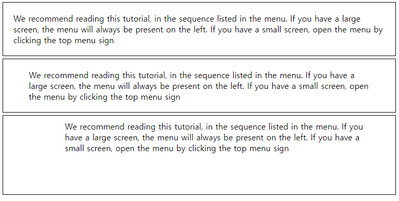 <!-- 박스모델의 프로퍼티값 설정하기 - top, right, bottom, left를 각각 지정하기 {padding-top:10px; padding-right:40px, padding-bottom: 80px; padding-left:120px;} - top, right, bottom, left의 값을 전부 같은 값으로 지정하기 {padding: 40px;} - top, bottom이 같은 값, right와 left를 같은 값으로 지정하기 {padding: 40px 80px;} /* top과 bottom은 40px, right와 left는 80px */ - top, right, bottom, left를 각각 다른 값으로 지정하기 {padding: 10px 20px 40px 80px;} /* top -> right -> bottom -> left 순으로 지정된다 */ --> <div style="padding:20px; margin-top: 5px;"> We recommend reading this tutorial, in the sequence listed in the menu. If you have a large screen, the menu will always be present on the left. If you have a small screen, open the menu by clicking the top menu sign </div> <div style="padding:20px 50px; margin-top: 5px;"> We recommend reading this tutorial, in the sequence listed in the menu. If you have a large screen, the menu will always be present on the left. If you have a small screen, open the menu by clicking the top menu sign </div> <div style="padding:10px 40px 80px 120px; margin-top: 5px;"> We recommend reading this tutorial, in the sequence listed in the menu. If you have a large screen, the menu will always be present on the left. If you have a small screen, open the menu by clicking the top menu sign </div><화면결과>