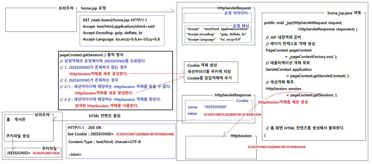 요청메세지의 헤더부분에서 세션아이디에 해당하는 HttpSession 객체가 있으면 getSession메소드는 session객체를 연결시킨다.