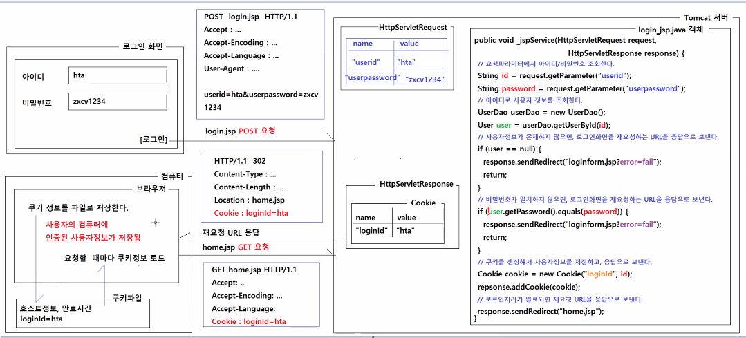 * 처음에는 쿠키정보가 없지만 로그인을 하고 나면 쿠키정보를 내려받게 된다. 이후에는 요청(Request)을 할 때마다 쿠키정보(Cookie : loginId=hta)가 로드되어서 요청메세지에 담겨서 간다.