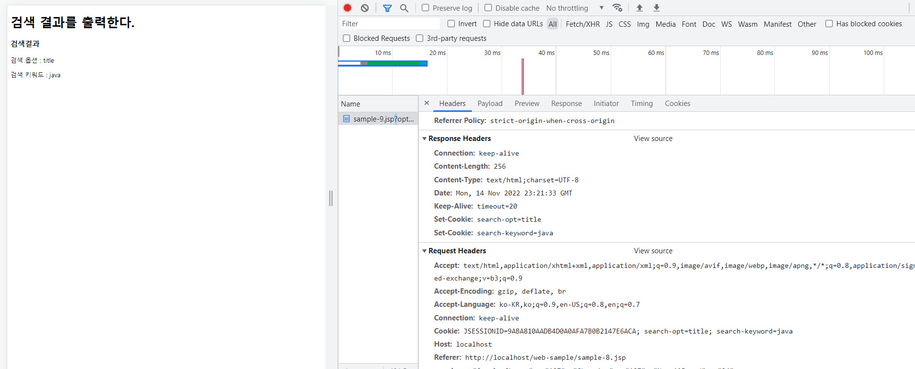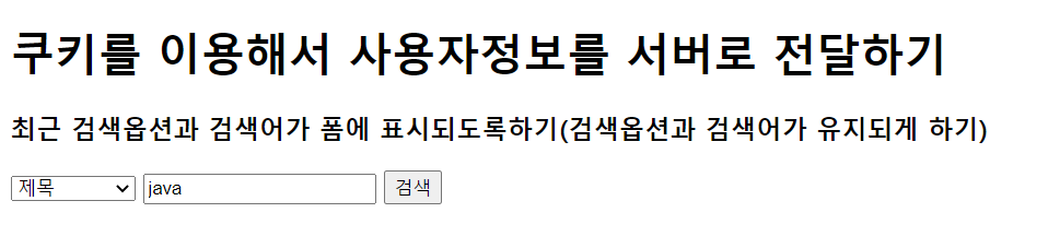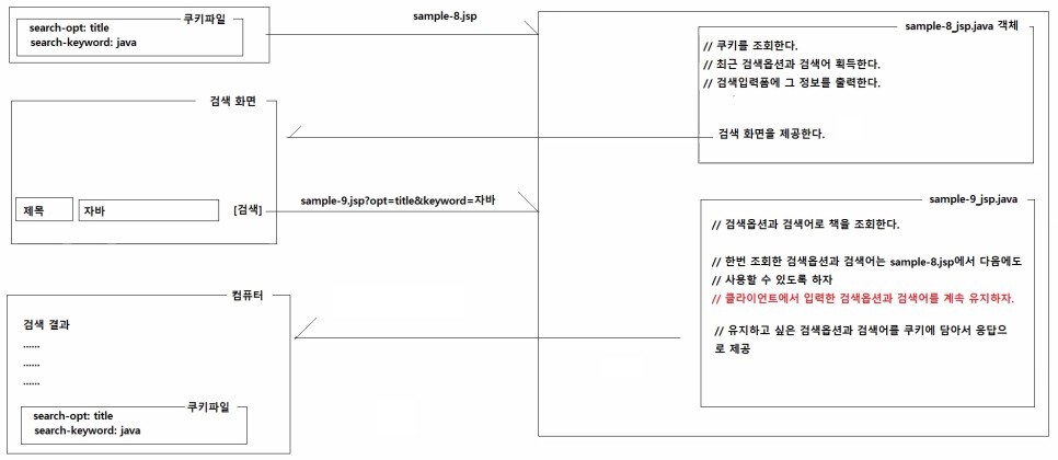 <title>sample-8</title> </head> <body> <h1>쿠키를 이용해서 사용자정보를 서버로 전달하기</h1> <% // 클라이언트에서 서버로 보낸 쿠키정보 조회하기 String searchOption = null; String searchKeyword = null; // 요청객체에서 모든 쿠키정보를 조회한다. Cookie[] cookies = request.getCookies(); // 조회된 모든 쿠키를 하나씩 검사한다. for (Cookie cookie : cookies) { // 쿠키의 이름을 조회한다. String name = cookie.getName(); if (name.equals("search-opt")) { // 쿠키의 이름이 search-option 인 경우 String value = cookie.getValue(); // 쿠키의 값을 조회한다. searchOption = value; } else if (name.equals("search-keyword")) { // 쿠키의 이름이 search-keyword 인 경우 String value = cookie.getValue(); // 쿠키의 값을 조회한다. searchKeyword = value; } } %> <h3>최근 검색옵션과 검색어가 폼에 표시되도록하기(검색옵션과 검색어가 유지되게 하기)</h3> <form method="get" action="sample-9.jsp"> <select name="opt"> <option value="" selected="selected" disabled="disabled"> 선택하세요</option> <option value="title" <%="title".equals(searchOption) ? "selected" : "" %>> 제목</option> <option value="author" <%="authoe".equals(searchOption) ? "selected" : "" %>> 저자</option> <option value="publisher" <%="publisher".equals(searchOption) ? "selected" : "" %>> 출판사</option> <option value="content" <%="content".equals(searchOption) ? "selected" : "" %>> 내용</option> </select> <input type="text" name="keyword" value="<%=searchKeyword != null ? searchKeyword : "" %>"> <button type="submit">검색</button> </form> </body><title>sample-9</title> </head> <body> <h1>검색 결과를 출력한다.</h1> <% String opt = request.getParameter("opt"); String keyword = request.getParameter("keyword"); // 최근 검색옵션과 최근 검색어를 쿠키를 생성해서 저장한다. Cookie cookie1 = new Cookie("search-opt", opt); Cookie cookie2 = new Cookie("search-keyword", keyword); // 쿠키를 응답객체에 추가해서 응답메세지에 쿠키정보를 표현시킨다. // 브라우저는 응답메세지로 전달받은 쿠키정보(최근 검색옵션과 검색어)를 쿠키파일로 저장한다. // 브라우저는 쿠키만료되기 전까지 요청을 보낼 때마다 요청메세지에 쿠키정보를 포함해서 서버로 보낸다. // 서버에서 실행중인 모든 JSP에서 필요한 쿠키정보를 조회해서 요청처리에 사용할 수 있다. response.addCookie(cookie1); response.addCookie(cookie2); %> <h3>검색결과</h3> <p>검색 옵션 : <%=opt %></p> <p>검색 키워드 : <%=keyword %></p> </body>