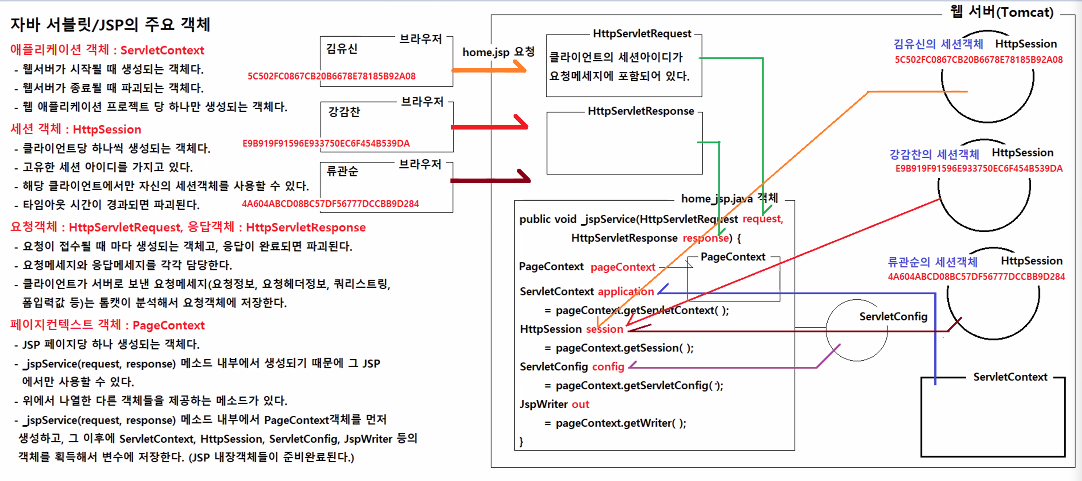 - _jspService(request, response) 메소드 내부에서 PageContext객체를 먼저 생성하고, 그 이후에 ServletContext, HttpSession, ServletConfig, JspWriter등의 객체를 획득해서 변수에 저장한다.
