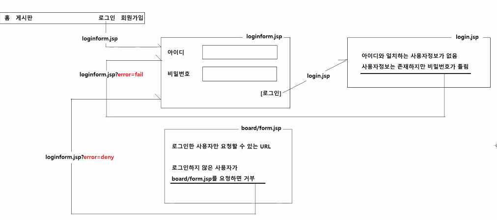 <board/form.jsp> <% // HttpSession객체에 저장된 인증된 사용자정보를 조회한다 User user = (User) session.getAttribute("loginedUser"); // 인증된 사용자 정보가 존재하지 않으면, 로그인 폼을 재요청하게 한다. if (user == null) { response.sendRedirect("../user/loginform.jsp?error=deny"); return; } %><loginform.jsp> <p>아이디, 비밀번호 입력해서 로그인하세요</p> <% if ("fail".equals(errorCode)) { %> <div class="alert alert-danger"> <strong>로그인 실패</strong> 아이디 혹은 비밀번호가 일치하지 않습니다. </div> <% } else if ("deny".equals(errorCode)) { %> <div class="alert alert-danger"> <strong>요청 거부</strong> 로그인한 사용자만 이용가능한 페이지입니다. </div> <% } %>