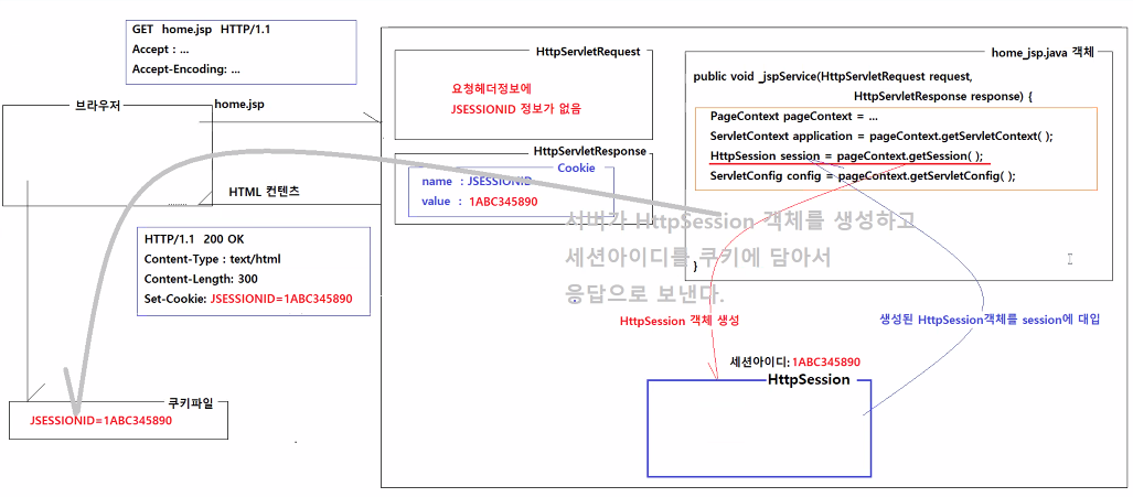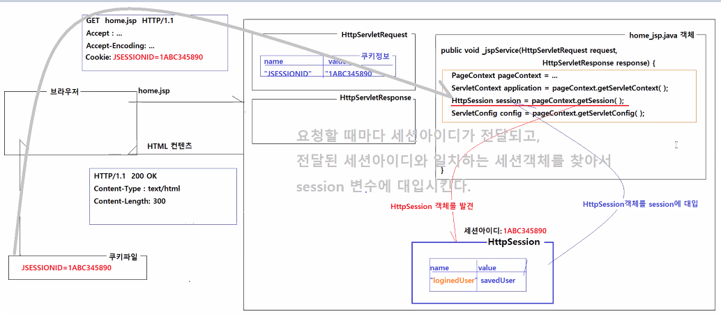 이후에는 이미 세션아이디가 있으니까 SESSION객체를 새로 만드는 대신에 검색하고 발견한다.