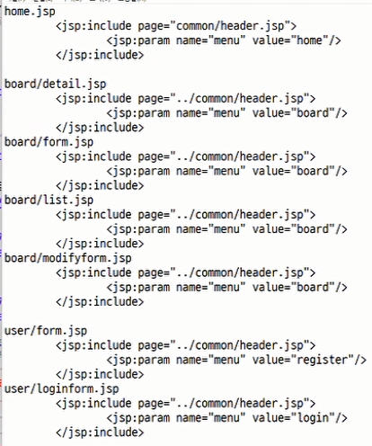 <header.jsp> <% String menu = request.getParameter("menu"); %> <nav class="navbar navbar-expand-sm bg-dark navbar-dark"> <div class="container"> <ul class="navbar-nav me-auto"> <li class="nav-item"><a class="nav-link <%="home".equals(menu) ? "active bg-danger" : "" %>" href="/web-board/home.jsp">홈</a></li> <li class="nav-item"><a class="nav-link <%="board".equals(menu) ? "active bg-danger" : "" %>" href="/web-board/board/list.jsp">게시판</a></li> </ul> <ul class="navbar-nav"> <li class="nav-item"><a class="nav-link <%="login".equals(menu) ? "active bg-danger" : "" %>" href="/web-board/user/loginform.jsp">로그인</a></li> <li class="nav-item"><a class="nav-link <%="register".equals(menu) ? "active bg-danger" : "" %>" href="/web-board/user/form.jsp">회원가입</a></li> </ul> </div> </nav>