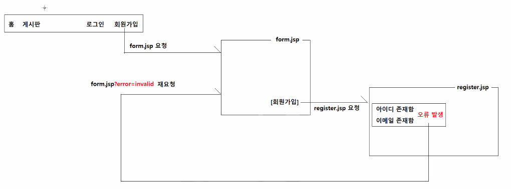 <form.jsp> <form class="bg-light border p-3" method="post" action="register.jsp"> <div class="mb-3"> <label class="form-label">아이디</label> <input type="text" class="form-control" name="id" /> </div> <div class="mb-3"> <label class="form-label">비밀번호</label> <input type="password" class="form-control" name="password" /> </div> <div class="mb-3"> <label class="form-label">이름</label> <input type="text" class="form-control" name="name" /> </div> <div class="mb-3"> <label class="form-label">이메일</label> <input type="text" class="form-control" name="email" /> </div> <div class="text-end"> <a href="../home.jsp" class="btn btn-secondary">취소</a> <button type="submit" class="btn btn-primary">회원가입</button> </div> </form><register.jsp> <% // 회원가입 폼에서 register.jsp를 실행요청할 때 제출한 폼 입력값을 요청객체에서 조회한다. String id = request.getParameter("id"); String password = request.getParameter("password"); String name = request.getParameter("name"); String email = request.getParameter("email"); // User 객체를 생성해서 조회된 값을 저장한다. User user = new User(); user.setId(id); user.setPassword(password); user.setName(name); user.setEmail(email); // UserDao 객체를 생성한다. UserDao userDao = new UserDao(); // 아이디로 사용자정보를 조회한다. 사용자정보가 null이 아니면 form.jsp를 재요청하는 URL을 응답으로 보낸다. User savedUser = userDao.getUserById(id); if (savedUser != null) { response.sendRedirect("form.jsp?error=invalid"); return; // 아래 코드가 실행안되도록 return을 꼭 적어둔다. } // 이메일로 사용자정보를 조회한다. 사용자정보가 null이 아니면 form.jsp를 재요청하는 URL을 응답으로 보낸다. savedUser = userDao.getUserByEmail(email); if (savedUser != null) { response.sendRedirect("form.jsp?error=invalid"); return; // 아래 코드가 실행안되도록 return을 꼭 적어둔다. } // insertUser(user)를 실행해서 데이터베이스 저장시킨다. userDao.insertUser(user); %><form.jsp> <% // 회원가입 실패로 form.jsp?error=invalid로 재요청했을 때 error의 값은 invalid다. String errorCode = request.getParameter("error"); %> <p>아이디, 비밀번호, 이름, 이메일을 입력해서 회원가입을 신청하세요</p> <% if ("invalid".equals(errorCode)) { // 반대로 쓰면 오류난다. errorCode가 없을 때는 null이니까 %> <div class="alert alert-danger"> <strong>회원가입 오류</strong> 아이디 혹은 이메일이 이미 사용중입니다. </div> <% } %>* 문자열하고 변수명을 비교할 때는 반드시 문자열, 상수를 .equals 앞에 적어야 한다.