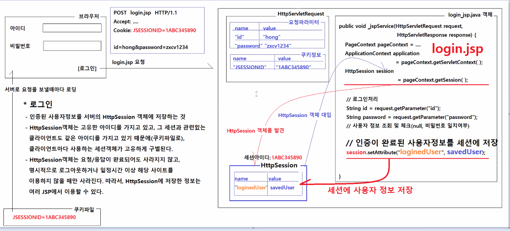 로그인 이후에는 어떤 jsp가 실행되어도 고유한 세션 객체가 연결되어있다.