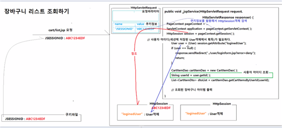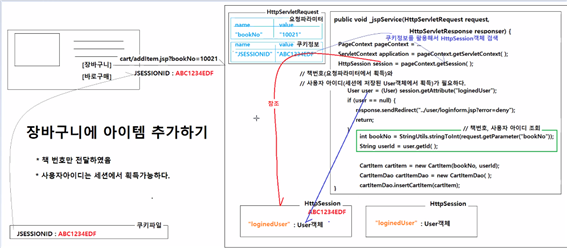 < carts.xml > <sqlMap namespace="carts"> <insert id="insertCartItem" parameterClass="com.sample.vo.CartItem"> insert into sample_board_book_cart_items (item_no, book_no, user_id) values (sample_carts_seq.nextval, #bookNo#, #userId#) </insert> </sqlMap>< CartItemDao.java > public class CartItemDao { public void insertCartItem(CartItem cartItem) { SqlMapper.insert("carts.insertCartItem", cartItem); }< addItem.jsp > <% // 장바구니 아이템정보를 저장하기 위해서 책번호(요청 파라미터에서 획득), // 사용자아이디(세션에 저장된 사용자정보에서 획득)가 필요함 // HttpSession객체에 "loginedUser"라는 이름을 저장된 사용자 정보를 조회한다.(user/login.jsp에서 저장해 둔 것) User user = (User) session.getAttribute("loginedUser"); if (user == null) { /* 현재 URL : http://localhost/web-board/cart/addItem.jsp?bookNo=10021 요청 URL : http://localhost/web-board/user/loginform.jsp?error=deny 기준 URL : http://localhost/web-board/cart/ 상대경로 : ../user/loginform.jsp?error=deny */ response.sendRedirect("../user/loginform.jsp?error=deny"); return; } // 요청파라미터에서 책번호 조회 int bookNo = StringUtils.stringToInt(request.getParameter("bookNo")); // 사용자 아이디 조회 String userId = user.getId(); // CartItem 객체를 생성하고, 책번호와 사용자아이디를 저장한다. CartItem cartItem = new CartItem(bookNo, userId); // CartItemDao객체를 생성하고, addCartItem(CartItem cartItem) 메소드를 실행해서 장바구니 아이템을 저장시킨다. CartItemDao cartItemDao = new CartItemDao(); cartItemDao.insertCartItem(cartItem); // 재요청 URL을 응답으로 보낸다. /* 현재 URL : http://localhost/web-board/cart/addItem.jsp?bookNo=10021 요청 URL : http://localhost/web-board/cart/list.jsp 기준 URL : http://localhost/web-board/cart/ 상대경로 : list.jsp */ response.sendRedirect("list.jsp"); %>