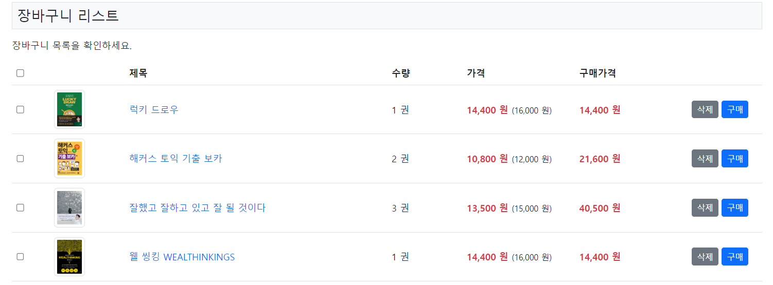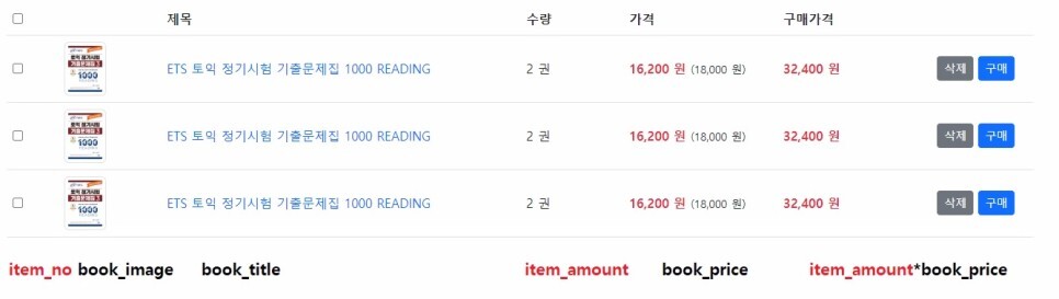 public class CartItemDto { private int itemNo; // sample_board_book_cart_items의 item_no private int bookNo; // sample_board_book_cart_items의 book_no private String userId; // sample_board_book_cart_items의 user_id private String title; // sample_board_books의 book_title private String image; // sample_board_books의 book_image private int amount; // sample_board_book_cart_items의 item_amount private int price; // sample_board_books의 book_price private int discountPrice; // sample_board_books의 book_discount_price private Date createdDate; // sample_board_book_cart_items의 item_created_date private Date updatedDate; // sample_board_book_cart_items의 item_updated_date public CartItemDto() {} public int getItemNo() { return itemNo; } public void setItemNo(int itemNo) { this.itemNo = itemNo; } public int getBookNo() { return bookNo; } public void setBookNo(int bookNo) { this.bookNo = bookNo; } public String getUserId() { return userId; } public void setUserId(String userId) { this.userId = userId; } public String getTitle() { return title; } public void setTitle(String title) { this.title = title; } public String getImage() { return image; } public void setImage(String image) { this.image = image; } public int getAmount() { return amount; } public void setAmount(int amount) { this.amount = amount; } public int getPrice() { return price; } public void setPrice(int price) { this.price = price; } public int getDiscountPrice() { return discountPrice; } public void setDiscountPrice(int discountPrice) { this.discountPrice = discountPrice; } public Date getCreatedDate() { return createdDate; } public void setCreatedDate(Date createdDate) { this.createdDate = createdDate; } public Date getUpdatedDate() { return updatedDate; } public void setUpdatedDate(Date updatedDate) { this.updatedDate = updatedDate; } @Override public String toString() { return "CartItemDto [itemNo=" + itemNo + ", bookNo=" + bookNo + ", userId=" + userId + ", title=" + title + ", image=" + image + ", amount=" + amount + ", price=" + price + ", discountPrice=" + discountPrice + ", createdDate=" + createdDate + ", updatedDate=" + updatedDate + "]"; } }< carts.xml > <select id="getCartItemsByUserId" parameterClass="string" resultClass="com.sample.dto.CartItemDto"> select A.item_no as itemNo, A.book_no as bookNo, A.user_id as userId, B.book_title as title, B.book_image as image, A.item_amount as amount, B.book_price as price, B.book_discount_price as discountPrice, A.item_created_date as createdDate, A.item_updated_date as updatedDate from sample_board_book_cart_items A, sample_board_books B where A.book_no = B.book_no and A.user_id = #value# </select> </sqlMap>< CartItemDao.java > @SuppressWarnings("unchecked") public List<CartItemDto> getCartItemsByUserId(String userId) { return (List<CartItemDto>) SqlMapper.selectList("carts.getCartItemsByUserId", userId); }< list.jsp > <% //HttpSession객체에 "loginedUser"라는 이름을 저장된 사용자 정보를 조회한다.(user/login.jsp에서 저장해 둔 것) User user = (User) session.getAttribute("loginedUser"); if (user == null) { response.sendRedirect("../user/loginform.jsp?error=deny"); return; // // 이코드가 실행이 안되면(로그인이 안되면) 아래의 코드가 의미가 없으니까 빨리 끝내라는 의미 } %> <!DOCTYPE html> <html> <head> <meta charset="UTF-8"> <meta name="viewport" content="width=device-width, initial-scale=1"> <link href="https://cdn.jsdelivr.net/npm/bootstrap@5.2.2/dist/css/bootstrap.min.css" rel="stylesheet"> <script src="https://cdn.jsdelivr.net/npm/bootstrap@5.2.2/dist/js/bootstrap.bundle.min.js"></script> <title>익명 게시판</title> <style type="text/css"> img.img-thumbnail {width: 53px; height: 68px;} </style> </head> <body> <jsp:include page="../common/header.jsp"> <jsp:param name="menu" value="cart"/> </jsp:include> <div class="container my-3"> <h1 class="mb-3 fs-4 border p-2 bg-light">장바구니 리스트</h1> <% // CartItemDao 객체를 생성하고, getCartItemsByUserId(String userId) 메소드를 실행해서 장바구니 아이템 목록을 조회한다. CartItemDao cartItemDao = new CartItemDao(); List<CartItemDto> dtoList = cartItemDao.getCartItemsByUserId(user.getId()); %> <p>장바구니 목록을 확인하세요.</p> <table class="table"> <colgroup> <col width="5%"> <col width="10%"> <col width="*"> <col width="10%"> <col width="15%"> <col width="15%"> <col width="10%"> </colgroup> <thead> <tr> <th><input type="checkbox"></th> <th></th> <th>제목</th> <th>수량</th> <th>가격</th> <th>구매가격</th> <th></th> </tr> </thead> <tbody> <% if (dtoList.isEmpty()) { %> <tr> <td colspan="7" class="text-center">장바구니에 저장된 책이 없습니다.</td> </tr> <% } else { for (CartItemDto dto : dtoList) { %> <tr class="align-middle"> <td><input type="checkbox" name="itemNo" value="<%=dto.getItemNo() %>" /></td> <td><img src="../resources/images/<%=dto.getImage() %>" class="img-thumbnail"></td> <td><a href="../book/detail.jsp?no=<%=dto.getBookNo() %>" class="text-decoration-none"><%=dto.getTitle() %></a></td> <td><%=dto.getAmount() %> 권</td> <td> <strong class="text-danger"><%=StringUtils.numberToText(dto.getDiscountPrice()) %> 원</strong> <small>(<%=StringUtils.numberToText(dto.getPrice()) %> 원)</small> </td> <td><strong class="text-danger"><%=StringUtils.numberToText(dto.getAmount()*dto.getDiscountPrice()) %> 원</strong></td> <td> <a href="deleteItem.jsp?itemNo=<%=dto.getItemNo() %>" class="btn btn-secondary btn-sm">삭제</a> <a href="" class="btn btn-primary btn-sm">구매</a> </td> </tr> <% } } %> </tbody> </table> <div class=""> <a href="" class="btn btn-secondary btn-sm" >전체 삭제</a> <a href="" class="btn btn-secondary btn-sm" >전체 구매</a> </div> </div> </body> </html>