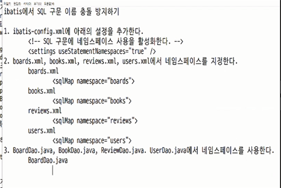 <settings useStatementNamespaces="true" /> // ibatis는 기본적으로 namespace를 비활성화하기 때문에 transactionManager 코드 위에 붙여준다.2. books.xml, boards.xml, reviews.xml, users.xml에서 네임스페이스를 지정한다.