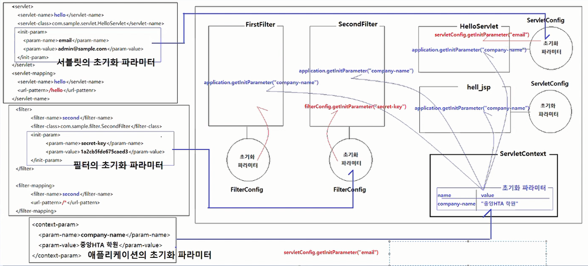 HelloServlet.java // 애플리케이션의 초기화 파라미터 정보를 제공하는 ServletContext객체를 획득한다. ServletContext application = getServletContext(); // String getInitParameter(String name)메소드를 초기화 파라미터값을 조회한다. String companyNameValue = application.getInitParameter("company-name");