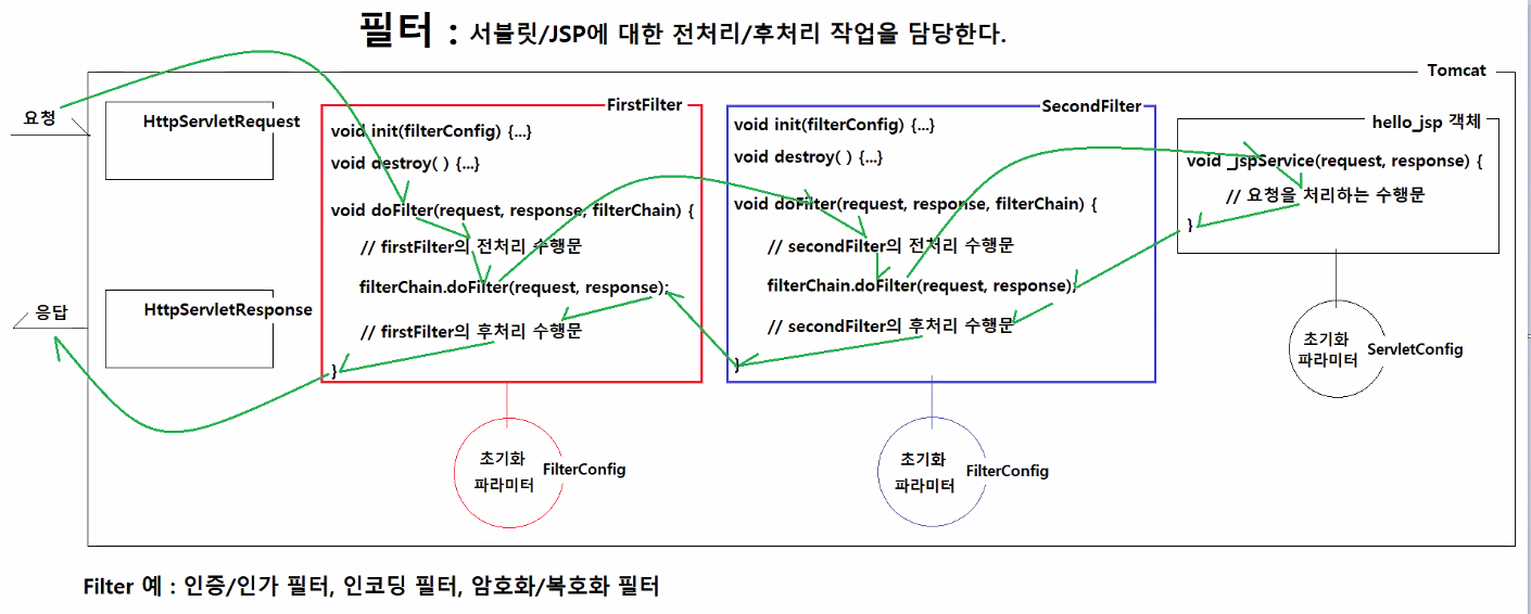 - Filter는 JSP 혹은 Servlet이 실행되기 전에, 실행된 후에 실행된다.