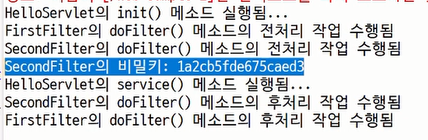 web.xml <filter> <filter-name>second</filter-name> <filter-class>com.sample.filter.SecondFilter</filter-class> <init-param> <param-name>secret-key</param-name> <param-value>1a2cb5fde675caed3</param-value> </init-param> </filter>secondFilter.java public class SecondFilter implements Filter { private String secretKey; private String companyName; @Override public void init(FilterConfig filterConfig) throws ServletException { System.out.println("SecondFilter의 init() 메소드 실행됨"); // 필터의 초기화 파라미터값 조회하기 this.secretKey = filterConfig.getInitParameter("secret-key"); } @Override public void destroy() { System.out.println("SecondFilter의 destroy() 메소드 실행됨"); } @Override public void doFilter(ServletRequest request, ServletResponse response, FilterChain filterChain) throws IOException, ServletException { System.out.println("SecondFilter의 doFilter() 메소드의 전처리 작업 수행됨"); // 필터의 초기화 파라미터값 사용하기 System.out.println("SecondFilter의 비밀키 : " + secretKey); filterChain.doFilter(request, response); System.out.println("SecondFilter의 doFilter() 메소드의 후처리 작업 수행됨"); } }