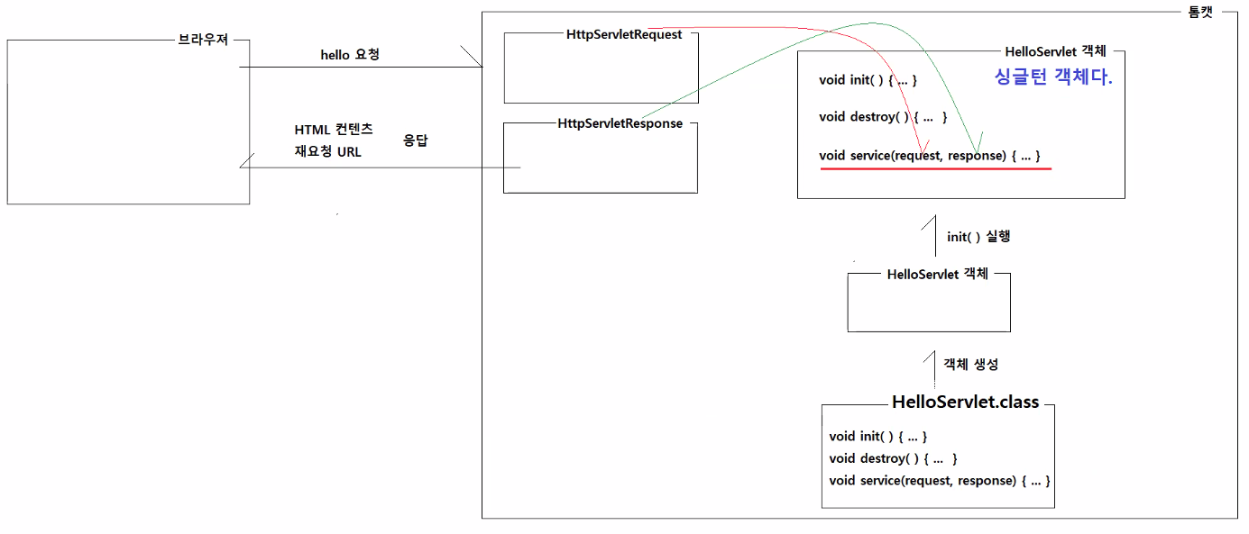- 객체가 만들어지면 또다른 hello라는 URL요청이 와도 새로 만들지 않고 유지하고 있는다.