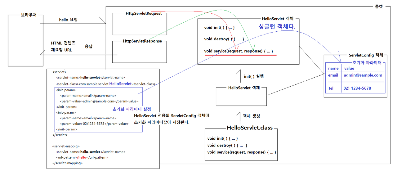 <!-- /hello URL 요청이 오면 hello-servlet이라는 별칭으로 배포된 com.sample.servlet.HelloServlet을 실행하라. --> <servlet> <servlet-name>hello-servlet</servlet-name> <servlet-class>com.sample.servlet.HelloServlet</servlet-class> <!-- HelloServlet에게 전달할 초기화 파라미터 값 설정하기 --> <init-param> <param-name>email</param-name> <param-value>admin@sample.com</param-value> </init-param> <init-param> <param-name>tel</param-name> <param-value>02) 1234-5678</param-value> </init-param> </servlet> <servlet-mapping> <servlet-name>hello-servlet</servlet-name> <url-pattern>/hello</url-pattern> <url-pattern>/hi</url-pattern> <url-pattern>/ye</url-pattern> </servlet-mapping>톰캣