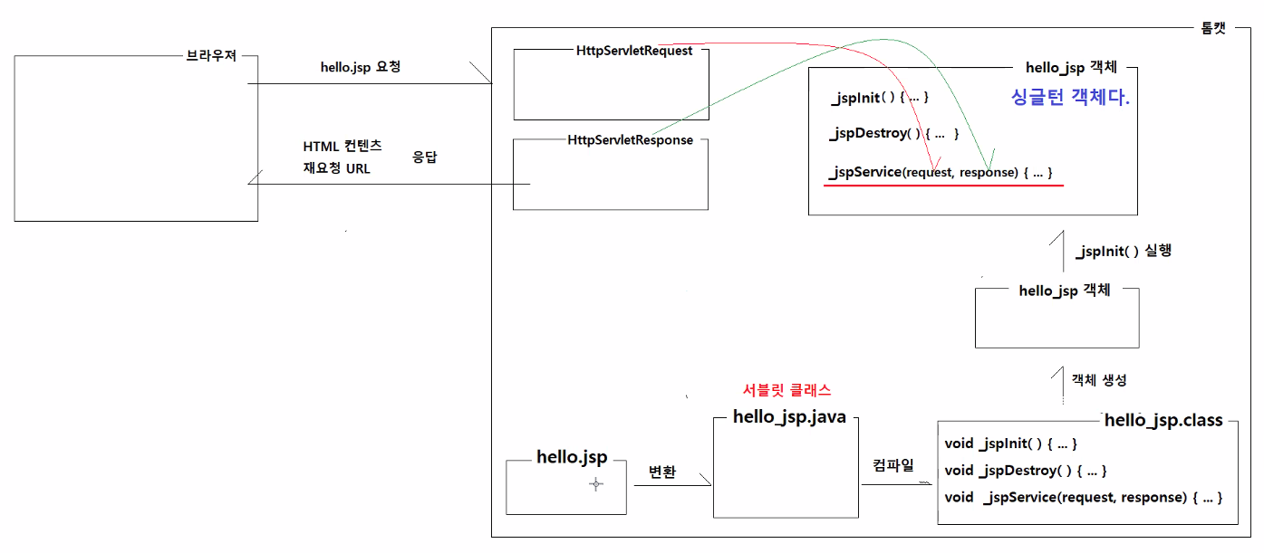 jsp가 실행되는 과정 - 톰캣에서 서비스라는 메소드는 클라이언트 요청이 올 때마다 계속적으로 실행된다.