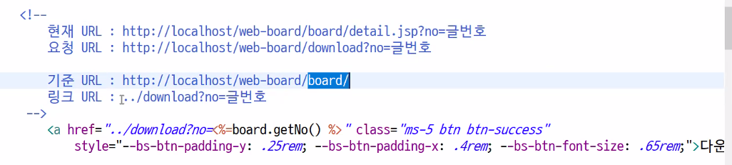 <tr> <th>첨부파일</th> <td colspan="3"> <%=board.getFileName() != null ? board.getFileName() : "없음" %> <% if (board.getFileName() != null) { %> <a href="../download?no=<%=board.getNo() %>" class="ms-5 btn btn-success" style="--bs-btn-padding-y: .25rem; --bs-btn-padding-x: .4rem; --bs-btn-font-size: .65rem;">다운로드</a> <% } %> </td> </tr>