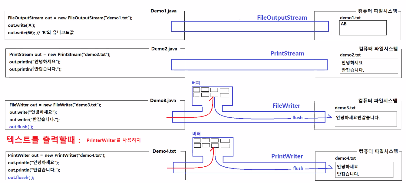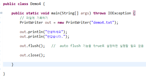 FileWriter와 PrintWriter는 버퍼에 저장했다가 flush를 실행하여 내보낸다. flush 하기 전에는 파일에 기록이 안된다.