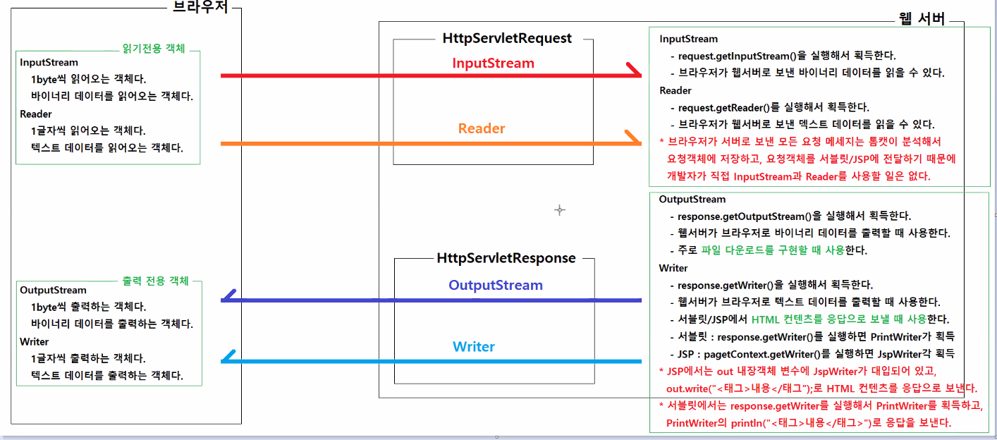 * 브라우저가 서버로 보낸 모든 요청 메세지는 톰캣이 분석해서 요청객체에 저장하고, 요청객체를 서블릿/JSP에 전달하기 때문에 개발자가 직접 InputStream과 Reader를 사용할 일은 없다.