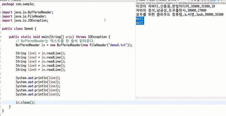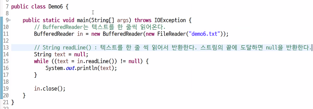 다른 스트림은 읽어올 게 없으면 -1을 반환하지만 BufferedReader의 경우만, 읽어올 게 없으면 null을 반환한다.