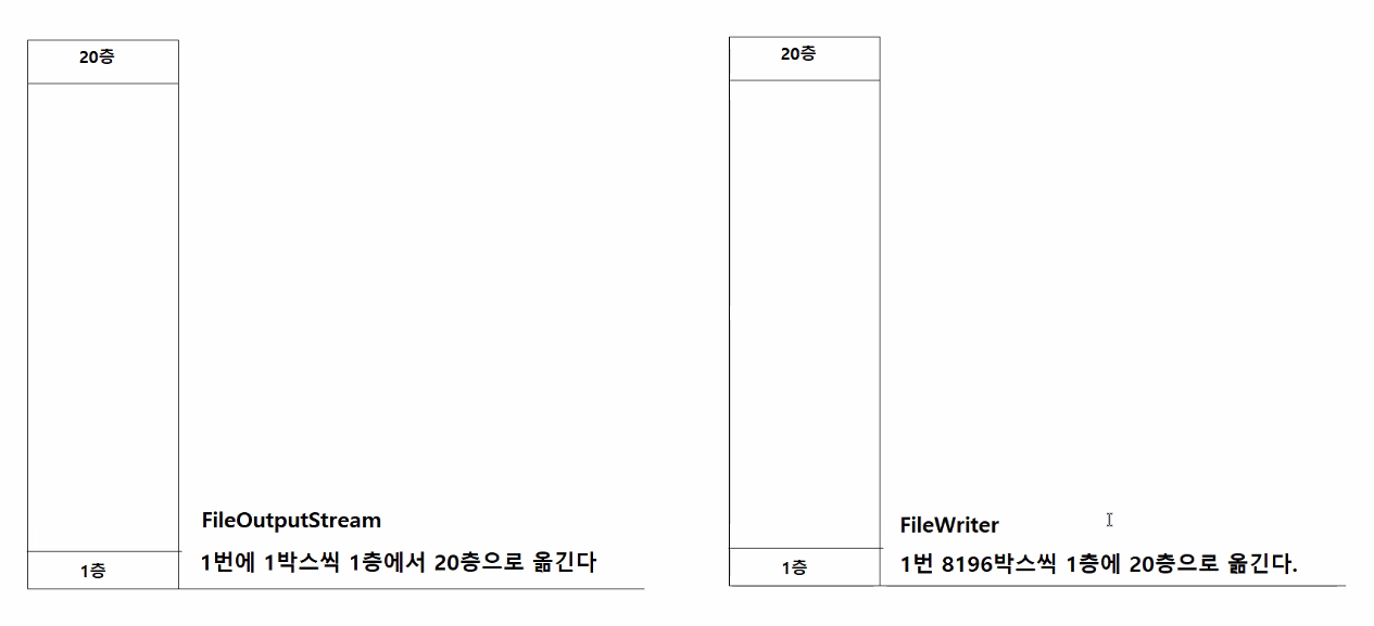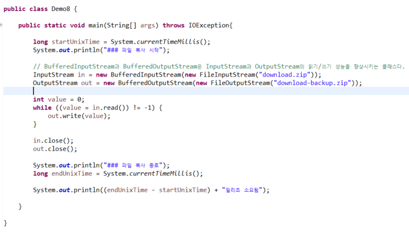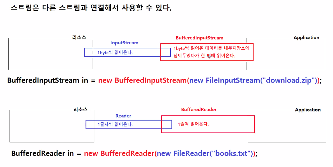 - BufferedInputStream, BufferedOutputStream은 다른 스트림의 성능을 향상시켜준다.