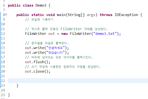 void close() - 쓰기 작업을 위해서 사용했던 컴퓨터의 자원을 반납한다.