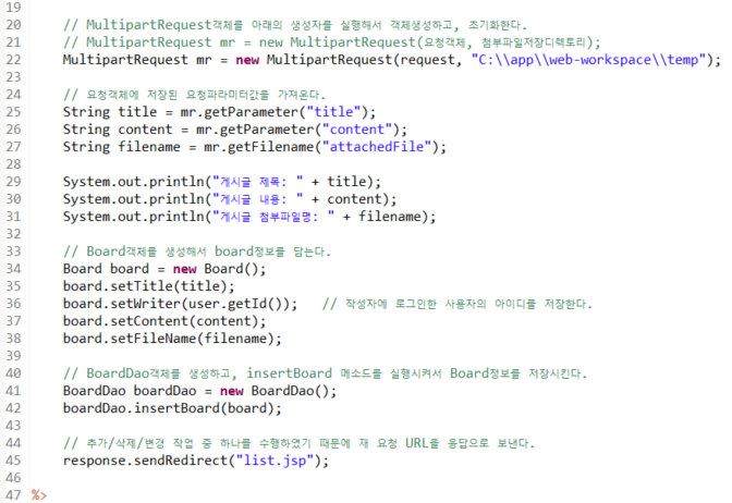 - 첨부파일 업로드 처리 : 서버로 업로드된 첨부파일을 읽어서 지정된 경로에 파일로 출력하는 것이다.