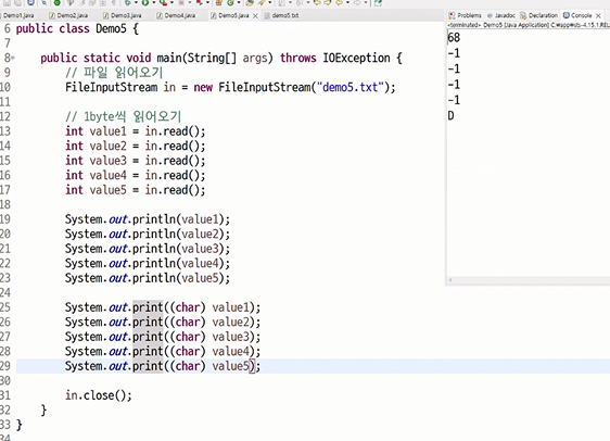 int read() - 1byte씩 읽어서 정수로 반환한다.
