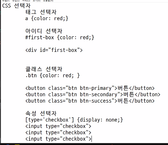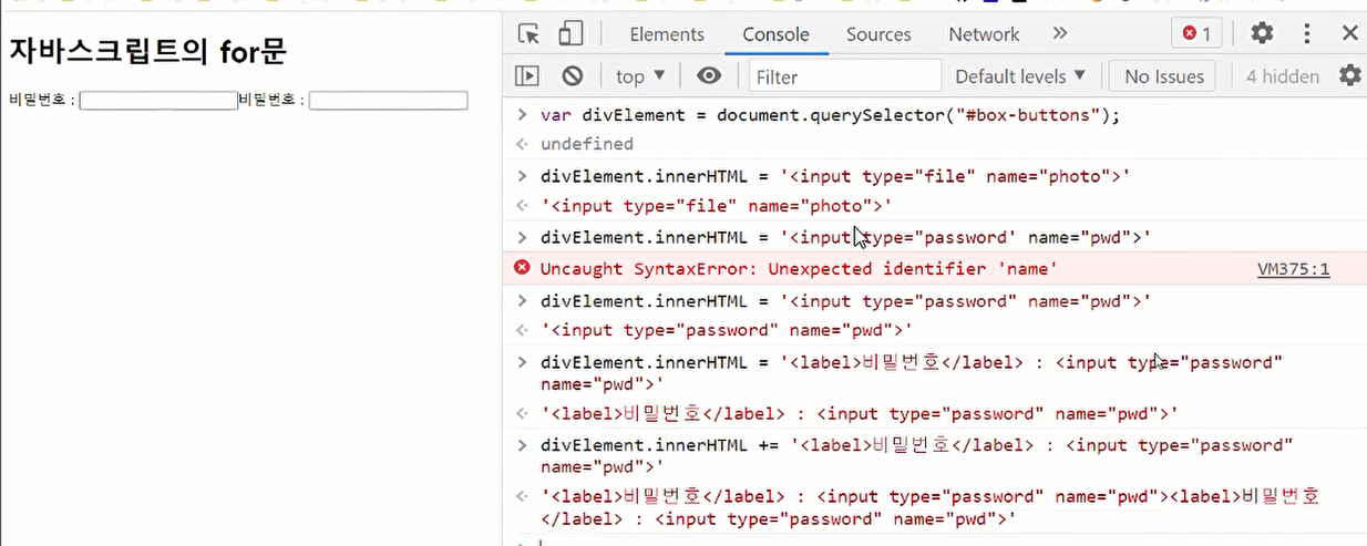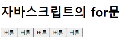 <option value="seoul" selected="selected"> 서울</option><html> <head> <meta charset="UTF-8"> <title>자바스크립트 if문 연습</title> </head> <body> <h1>자바스크립트 if문 연습</h1> <form id="form-login" method="post" action="login.jsp"> <div> <label>아이디</label> : <input type="text" name="id" /> </div> <div> <label>비밀번호</label> : <input type="password" name="pwd" /> </div> <button type="button" onclick="checkInputField();">로그인</button> </form> <script type="text/javascript"> // 1. 로그인 버튼을 클릭했을 때 checkInputFiled() 함수가 실행되어야 한다. function checkInputField() { // 2. name속성이 id인 엘리먼트의 입력값을 조회해서 변수 userId에 대입한다. var userId = document.querySelector("[name=id]").value; // 3. name속성이 pwd인 엘리먼트의 입력값을 조회해서 변수 userPassword에 대입한다. var userPassword = document.querySelector("[name=pwd]").value; // 4. 변수 userId에 대입된 값이 ''와 일치하면 '아이디는 필수입력값입니다.'경고창을 표시한다. // * 경고창은 alert("메세지") 스크립트 내장함수를 사용한다. if (userId === '') { alert("아이디는 필수입력값입니다."); return; // 빠른종료 return 빼먹지 말것!! } // 5. 변수 userPassword에 대입된 값이 ''와 일치하면 "비밀번호는 필수입력값입니다." 경고창을 표시한다. if (userPassword === '') { alert("비밀번호는 필수입력값입니다."); return; } // 6. 아이디, 비밀번호 모두 입력했으면 form 입력값을 서버로 제출한다. // id속성값이 form-login인 엘리먼트를 조회해서 formElement 변수에 대입한다. var formElement = document.querySelector("#form-login"); // formElement에 대입된 Element객체는 form태그를 표현하는 엘리먼트객체다. // form태그를 표현하는 엘리먼트객체는 폼 입력값을 서버로 제출시키는 submit() 메소드를 가지고 있다. formElement.submit(); } </script> </body> </html><html> <head> <meta charset="UTF-8"> <title>자바스크립트의 반복문</title> </head> <body> <h1>자바스크립트의 for문</h1> <!-- 자바스크립트의 반복문 for(초기식; 조건식; 증감식) { 수행문; } while (조건식) { 수행문; } --> <div id="box-buttons"></div> <script type="text/javascript"> // 1부터 10까지 출력하기 for (var num = 1; num<= 10; num++) { console.log("num->", num); } // id속성값이 box-buttons인 엘리먼트를 조회하고, 그 엘리먼트에 버튼을 5개 추가하기 // 1. button 태그를 담는 변수를 선언하고, 초기화한다. var buttons = ""; // 2. for문을 사용해서 <button>버튼</button>태그를 htmlContent에 계속 추가한다. for (var num = 1; num <= 5; num++) { buttons += "<button>버튼</button>"; } // 3. 아이디 속성값이 box-buttons인 엘리먼트를 찾아서 divElement에 대입한다. var divElement = document.querySelector("#box-buttons"); // 4. divElement의 innerHTML 프로퍼티에 buttons 변수에 저장된 버튼태그들을 추가한다. divElement.innerHTML = buttons; </script> </body> </html>