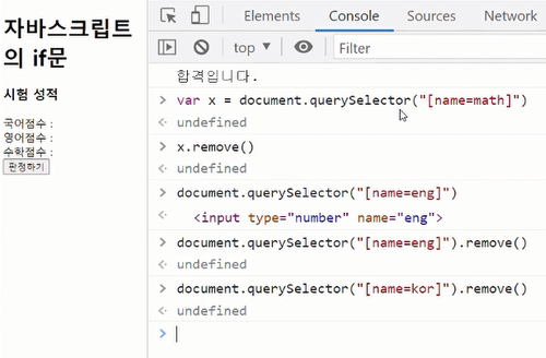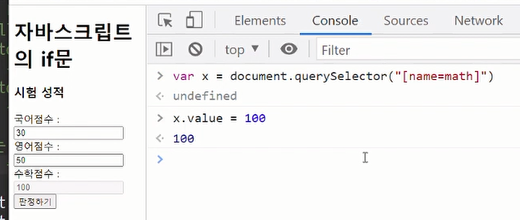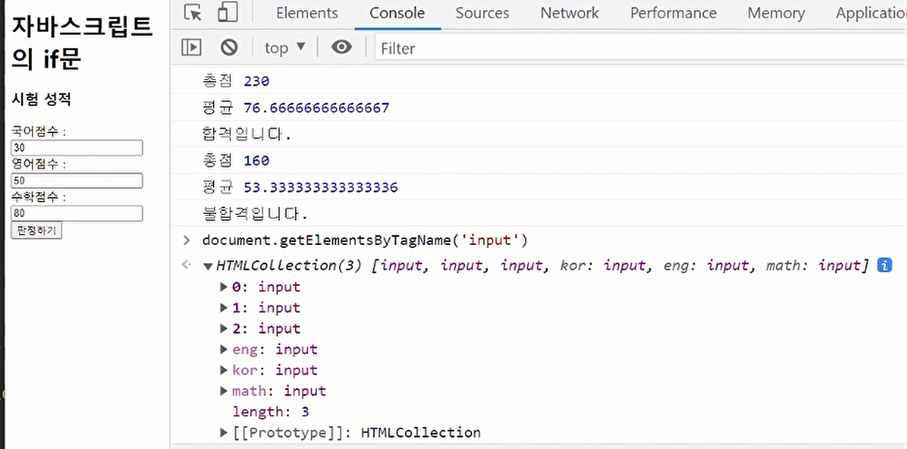 태그명, 태그의 속성, 태그의 텍스트 컨텐츠, 태그의 프로퍼티 값과 다양한 메소드를 포함하고 있다.<html> <head> <meta charset="UTF-8"> <title>자바스크립트의 if문</title> </head> <body> <h1>자바스크립트의 if문</h1> <h3>시험 성적</h3> <form> <div> <label>국어점수</label> :<input type="number" name="kor" /> </div> <div> <label>영어점수</label> :<input type="number" name="eng" /> </div> <div> <label>수학점수</label> :<input type="number" name="math" /> </div> <button type="button" onclick="checkScore();">판정하기</button> </form> <script type="text/javascript"> function checkScore(){ var korScore = document.querySelector("[name=kor]").value; // 선택할거다.name속성의 값이 kor인 것을 var engScore = document.querySelector("[name=eng]").value; var mathScore = document.querySelector("[name=math]").value; var totalScore = parseInt(korScore) + parseInt(engScore) + parseInt(mathScore); var avgScore = totalScore/3; console.log("총점", totalScore); console.log("평균", avgScore); if (avgScore >= 60) { console.log("합격입니다."); } else { console.log("불합격입니다."); } } var x = 80; if (x >= 60) { console.log("합격입니다."); } else { console.log("불합격입니다."); } </script> </body> </html>