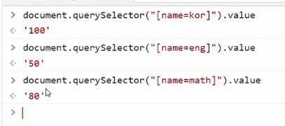 html문서 안의 name이 kor이라는 엘리먼트 객체를 조회하라. element 객체안의 value라는 프로퍼티(속성, 객체의 멤버변수) 안에 들어있는 값을 가져온 것이다.