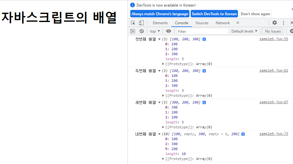 <html> <head> <meta charset="UTF-8"> <title>자바스크립트의 배열</title> </head> <body> <h1>자바스크립트의 배열</h1> <script type="text/javascript"> /* 자바스크립트의 배열객체 - 가변길이 배열이다. (자바의 배열길이는 불변) - 다양한 메소드를 지원한다. 배열객체의 생성 1. 빈 배열객체 생성 var x = []; 2. 값이 포함되어 있는 배열객체 생성 var x = [값, 값, 값, 값]; 배열객체에 값 추가하기 1. 배열객체를 생성하고, 배열객체에 값을 추가하기 var x = []; // 길이가 0인 배열 x[0] = 10; x[1] = 20; x[2] = 30; x[3] = 40; x[4] = 100; // x = [10, 20, 30, 40, 100] 2. 배열객체를 생성하고, 배열객체에 값을 추가하기 var x = []; x[0] = 10; x[4] = 100; // x = [10, undefined, undefined, undefined, 100] 3. 배열객체를 생성하고, 배열객체에 값 추가하기 (인덱스 없이 하는 방법) var x = [100, 200, 300]; x.push(10); // ArrayList의 add(E e) 메소드와 동일하다. x.push(20); x.push(30); // x = [100, 200, 300, 10, 20, 30] 4. 배열객체를 생성하고, 배열객체에 값 추가하기 var x = [100, 200, 300]; x.unshift(10); // 배열의 맨 앞에 추가한다. x.unshift(20); x.unshift(30); // x = [30, 20, 10, 100, 200, 300] */ // 빈 배열객체를 생성해서 items1에 대입한다. items1은 빈 배열객체를 참조하는 참조변수이다. var items1 = []; items1[0] = 100; items1[1] = 200; items1[2] = 300; console.log("첫번째 배열", items1); var items2 = []; items2.push(100); items2.push(200); items2.push(300); console.log("두번째 배열", items2); var items3 = []; items3.unshift(100); items3.unshift(200); items3.unshift(300); console.log("세번째 배열", items3); var items4 = []; items4[0] = 100; items4[2] = 300; items4[9] = 200; console.log("네번째 배열", items4); </script> </body> </html>