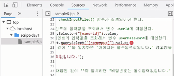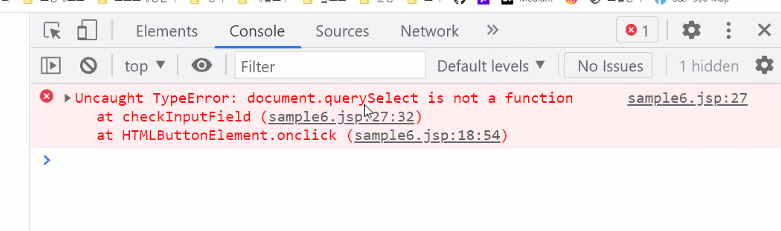 sample6.jsp:27번 라인에서 오류 났음을 알 수 있다. sample6.jsp:27를 클릭하면 에러난 소스코드를 보여줘서 어디가 틀렸는지 확인할 수 있다.