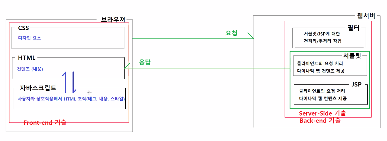 - 서블릿이나 jsp를 실행해서 응답이 와야 front-end 기술을 작동시킬 수 있다.