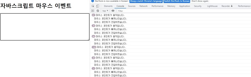<title>자바스크립트 마우스 이벤트</title> </head> <body> <h1>자바스크립트 마우스 이벤트</h1> <form> <textarea rows="10" style="width: 100%;" name="content" id="content-field" onmouseenter="mouseenter(event);" onmouseleave="mouseleave(event)"></textarea> </form> <script type="text/javascript"> // 아이디가 content-file인 <textarea> 태그를 표현하는 엘리먼트객체를 조회한다. var el = document.querySelector("#content-field"); // 엘리먼트 객체의 프로퍼티에 이벤트핸들러 함수를 등록한다. //el.onmouseenter = mouseenter; //el.onmouseleave = mouseleave; el.onmousedown = mousedown; el.onmouseup = mouseup; el.onmousemove = mousemove; function mouseenter(event) { console.log("마우스 포인트가 진입하였습니다.", event.target); } function mouseleave(event) { console.log("마우스 포인트가 빠져나갔습니다.", event.target); } // 이벤트 핸들러 함수는 Event객체를 전달받을 수 있다. function mousedown(event) { //console.log("마우스 버튼이 눌려졌습니다.", event); el.value = event.which + "버튼 down"; } function mouseup(e) { //console.log("마우스 버튼이 떨어졌습니다.", e); el.value = event.which + "버튼 up"; } function mousemove(e) { //console.log("마우스 포인트가 움직입니다.", e); } </script> </body> </html>