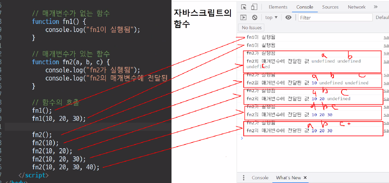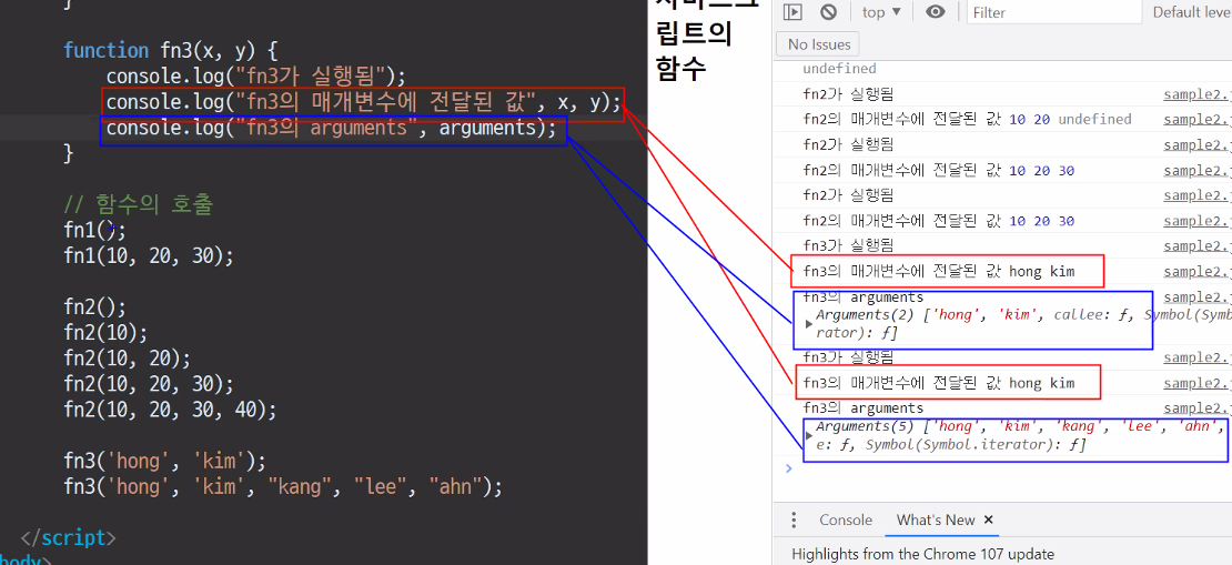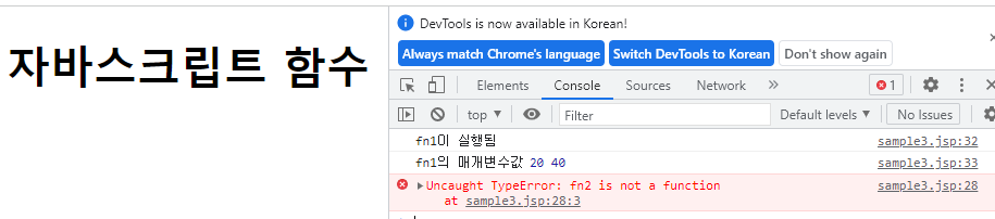 <title>자바스크립트 함수</title> </head> <body> <h1>자바스크립트 함수</h1> <script type="text/javascript"> fn1(20, 40); // fn2(30, 60); // 오류발생, 함수표현식으로 정의된 함수는 해당 표현식 이후 수행문에서만 사용가능하다. // 함수 선언식으로 함수 정의 function fn1(x, y) { console.log("fn1이 실행됨"); console.log("fn1의 매개변수값", x, y); } // 함수 표현식으로 함수 정의 var fn2 = function(x, y) { console.log("이름없는 함수가 실행됨"); console.log("이름없는 함수의 매개변수값", x, y); } // 함수의 실행 fn1(10, 20); // 함수이름이 fn1인 함수를 실행한다. fn2(100,200); // fn2변수에 대입되어 있는 이름없는 함수를 실행한다. </script> </body>함수이름은 함수를 가리키는 포인터가 된다.