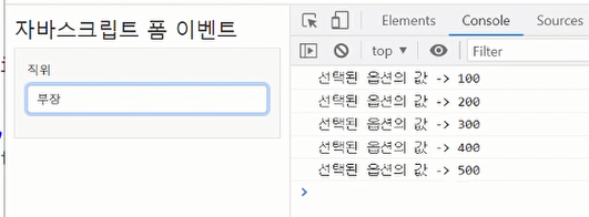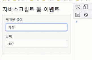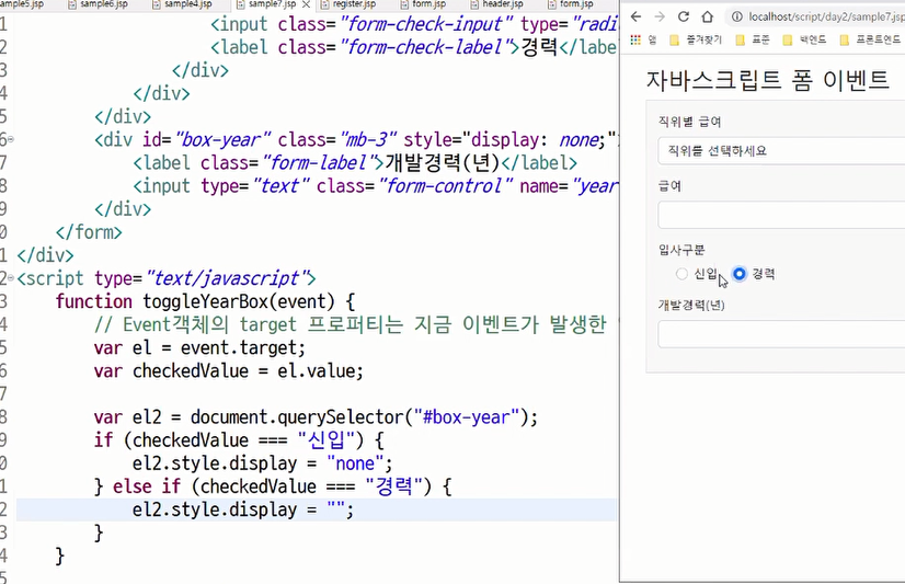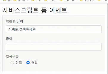 <title>자바스크립트 폼 이벤트</title> </head> <body> <div class="container my-3"> <h1>자바스크립트 폼 이벤트</h1> <form class="bg-light border p-3" method="post" action="register.jsp"> <div class="mb-3"> <label class="form-label">직위별 급여</label> <select class="form-control" name="position" onchange="checkPosition();"> <option value=""> 직위를 선택하세요</option> <option value="100"> 사원</option> <option value="200"> 대리</option> <option value="300"> 과장</option> <option value="400"> 차장</option> <option value="500"> 부장</option> </select> </div> <div class="mb-3"> <label class="form-label">급여</label> <input type="number" class="form-control" name="salary"> </div> <div class="mb-3"> <label class="form-label">입사구분</label> <div class="form-check"> <div class="form-check form-check-inline"> <input class="form-check-input" type="radio" name="type" value="신입" checked="checked" onchange="toggleYearBox(event);"> <label class="form-check-label">신입</label> </div> <div class="form-check form-check-inline"> <input class="form-check-input" type="radio" name="type" value="경력" onchange="toggleYearBox(event);"> <label class="form-check-label">경력</label> </div> </div> </div> <div id="box-year" class="mb-3" style="display: none;"> <label class="form-label">개발경력(년)</label> <input type="text" class="form-control" name="year" /> </div> </form> </div> <script type="text/javascript"> function toggleYearBox(event) { // Event객체의 target 프로퍼티는 지금 이벤트가 발생한 엘리먼트가 저장되어 있다. var el = event.target; var checkedValue = el.value; var el2 = document.querySelector("#box-year"); if (checkedValue === "신입") { el2.style.display = "none"; } else if (checkedValue === "경력") { el2.style.display = ""; } } function checkPosition() { //console.log("checkPosition()이 실행됨"); var el = document.querySelector("select[name=position]"); var selectedValue = el.value; //console.log("선택된 옵션의 값 ->", selectedValue) var el2 = document.querySelector("input[name=salary]"); el2.value = selectedValue; } </script> </body> </html>el2.style.display="none", el2.style.display=""으로 경력 입력칸이 보였다가 안보였다가 할 수 있다.
